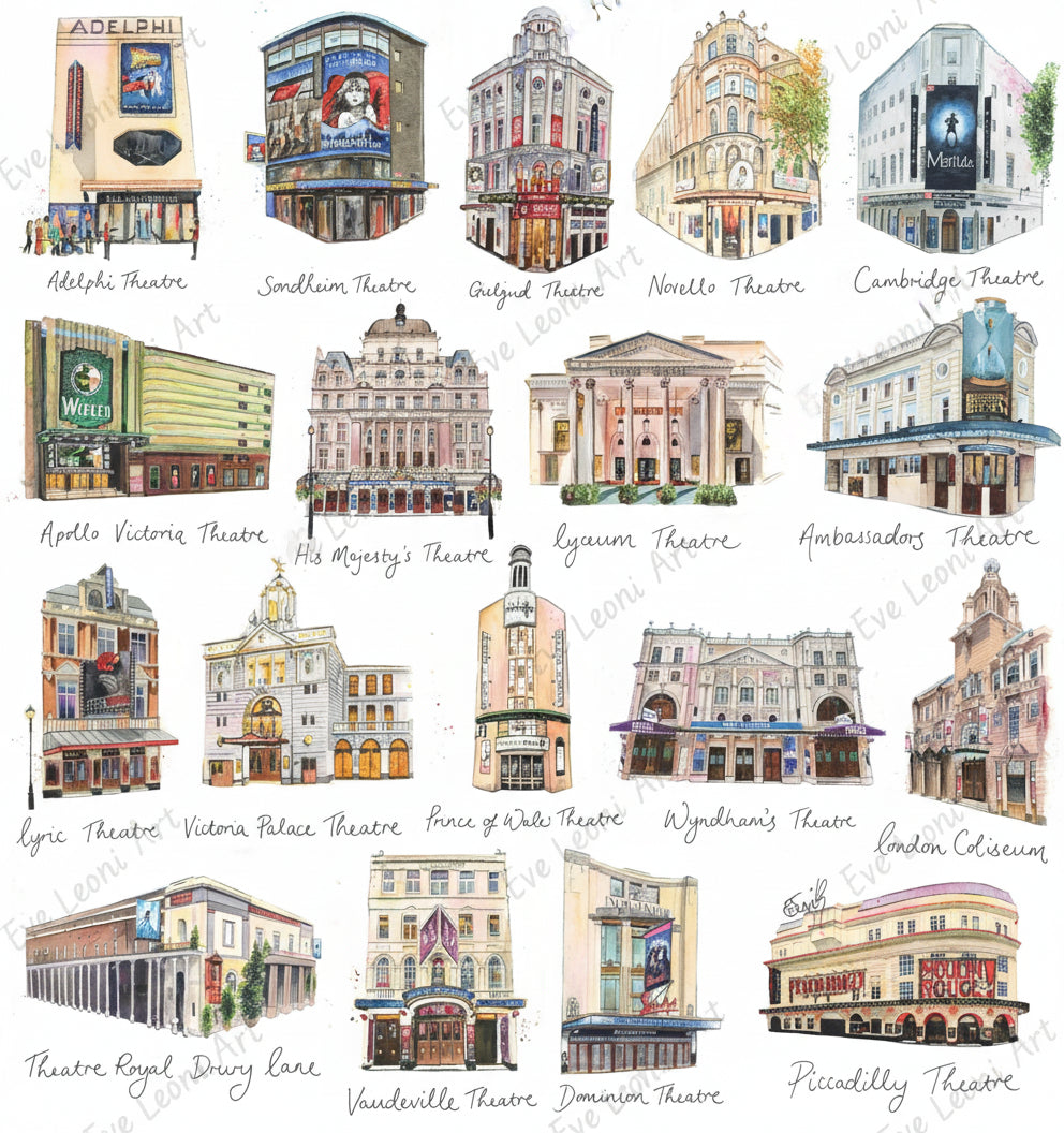 Adelphi Theatre, Sondheim Theatre, Gielgud Theatre, Novello Theatre, Cambridge Theatre, Apollo Victoria, His Majesty’s Theatre, Lyceum Theatre, Ambassador’s Theatre, Lyric Theatre, Victoria Palace Theatre, Prince of Wales Theatre, Wyndham’s Theatre, London Coliseum, Theatre Royal Drury Lane, Vaudeville Theatre, Dominion Theatre and Piccadilly Theatre.